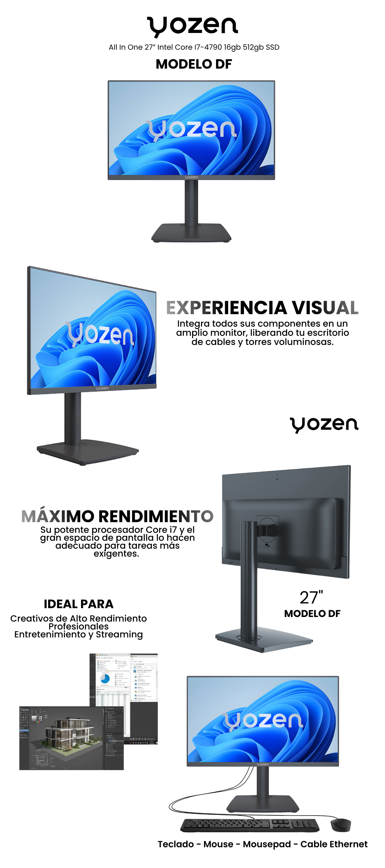 Optimiza tu productividad y disfruta de una experiencia multimedia inmersiva con la Computadora Todo en Uno (All In One) Modelo DF. Este equipo de alto rendimiento combina una espectacular pantalla de 27 pulgadas con un potente procesador Core i7 y almacenamiento SSD ultra rápido.